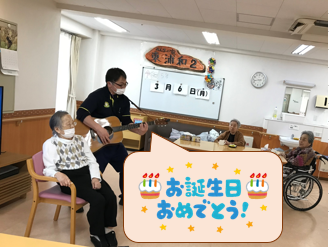 先日お誕生日のご利用者様がいらして、職員がギター(持参)を披露してくれました(^^♪