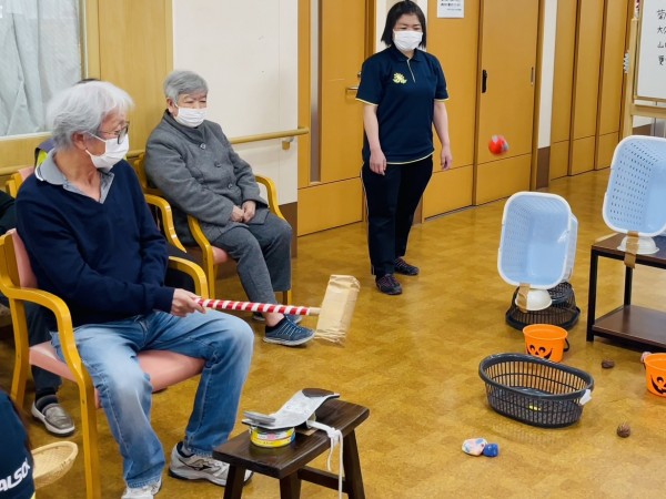 お手玉を点数の書かれたカゴめがけて飛ばします。