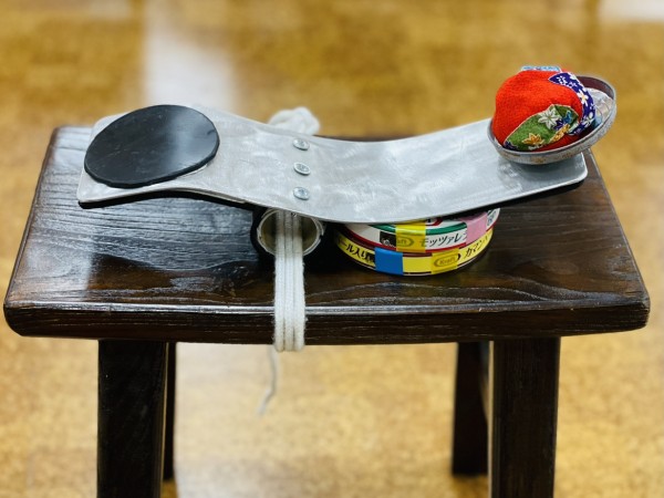 職員手作りの飛ばし台を手作りハンマーでたたきカゴ