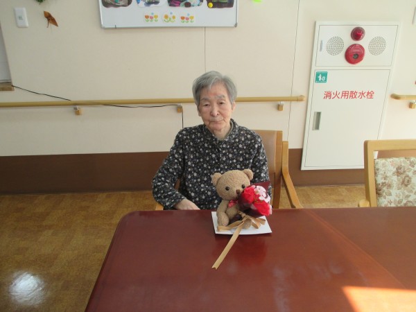 コロナの影響で、しばらく面会が出来なかったこともあり、ご家族様と久しぶりに面会が出来、涙ぐまれ、ご家族様とお話されておりました!!。ご家族様が、帰り際に「プレゼント」を渡され、ご家族様へ、『可愛いプレゼント、ありがとう!!」、「大切に飾るね」等とお礼を仰ってました!!。