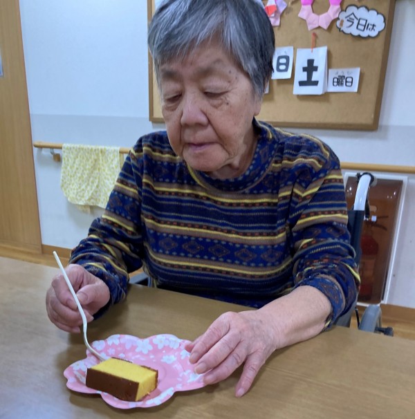 本日のおやつはカステラ、芋羊羹、雛あられ、ふがし、にデコレーションにわたあめをあしらってみました♪