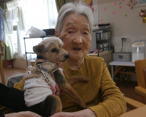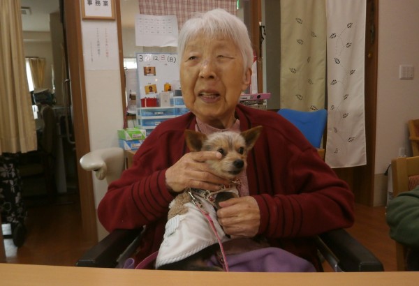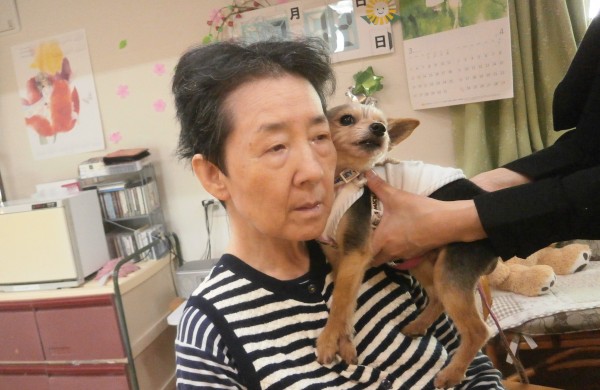 3. ドッグセラピー!思いがけず職員の愛犬登場!わぁ!!!可愛い!みんな大喜びで、かわるがわる抱かせていただきました!全くほえないレオ君。また来てね!