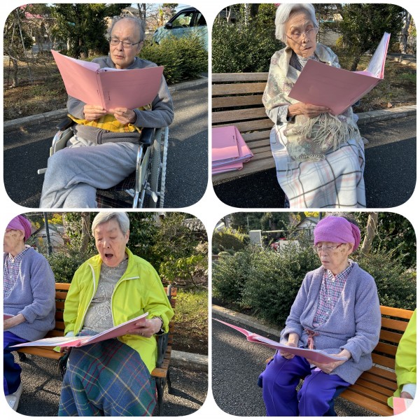 今年は暖かい日が多くいつもより外に出る機会があるように思います。当施設は駐車場が広いので外気浴には最適!!先日も暖かな陽射しに誘われて皆さんと一緒に『青空』の下外気浴を兼ねて合唱をしました。