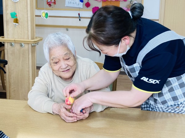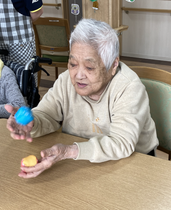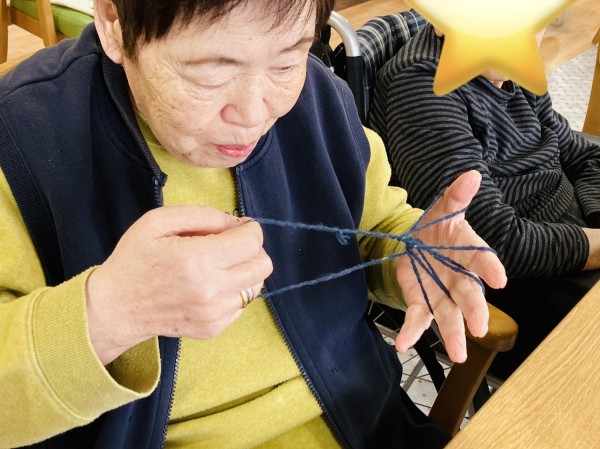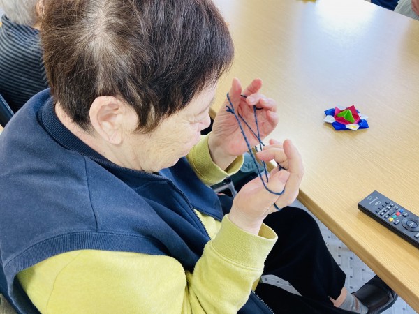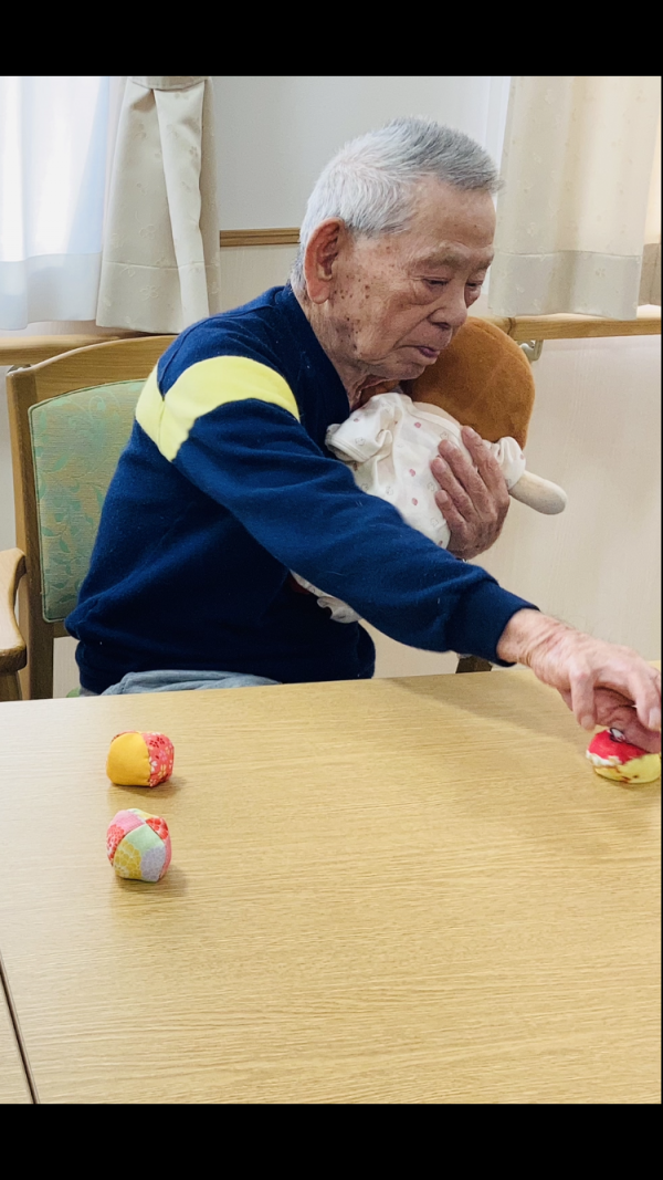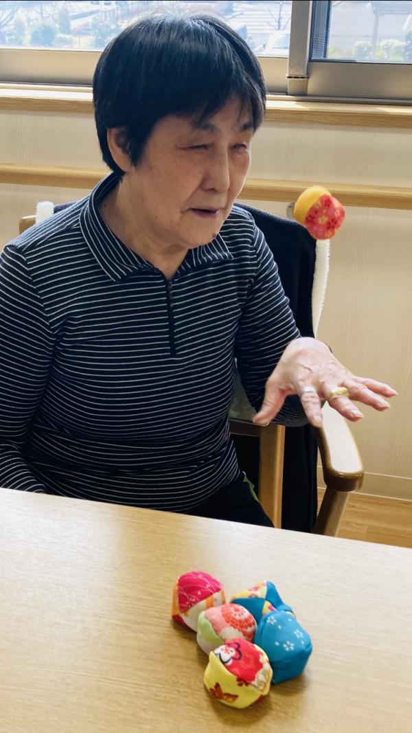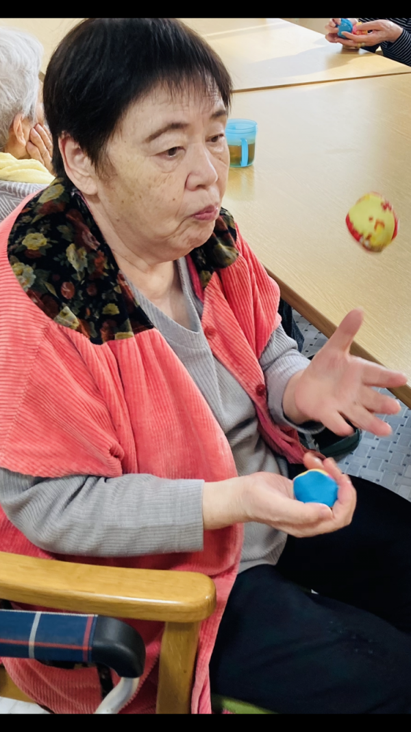皆さんの思い出のひとつでもある、まずはあやとりをやって見ました♪指や手がしっかりと覚えているもんですね〜❣️「見ててね」真剣な表情で「何が出来るかなぁ?」次はお手玉です。照れながらも皆さんとても楽しそうですね❣️