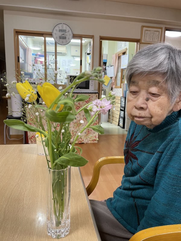 チューリップ等の季節の花が入っており、皆様「きれいだねぇ」とニコニコでした。