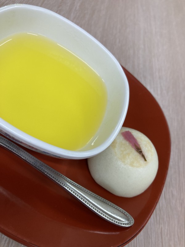 今日のおやつは桜の花を乗せたお饅頭(本物)ほのかに香ります( *´艸`)