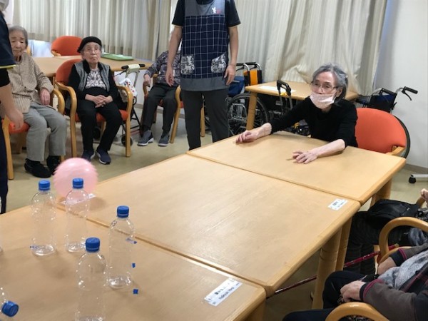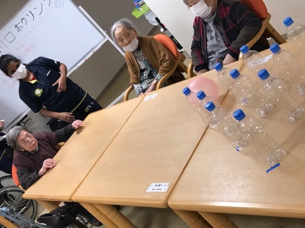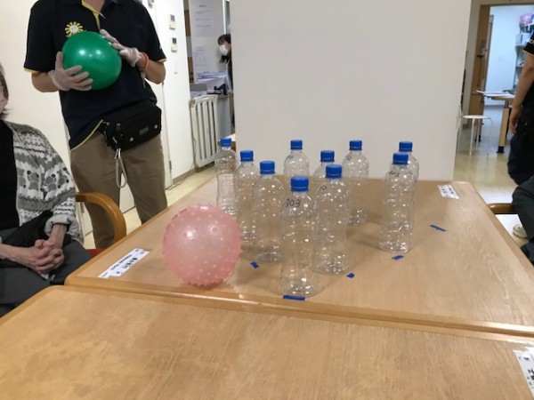 ペットボトルのピンを、3種のボールを投げて倒していきます。