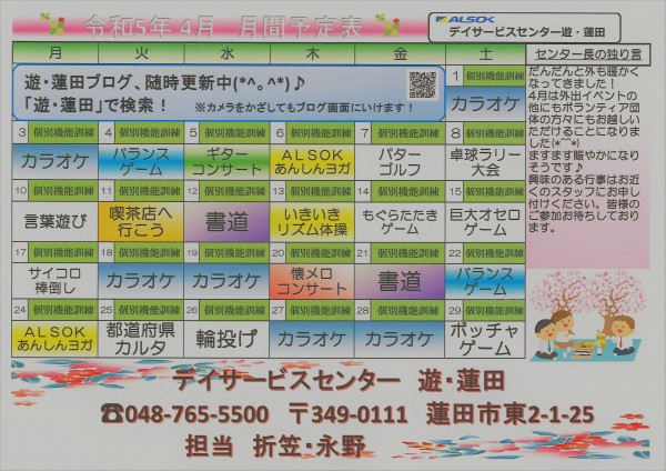 話は変わって本日は4月の予定表が完成しましたのでこちらのお知らせになります。