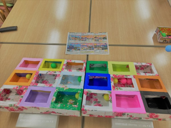 チームに分かれ、球をバウンドして箱の中にいれていきます。なお、色とちょうどあう球を箱に入れると高得点となり、逆に相手チームの方に球が箱に入ると相手側の得点になります!
