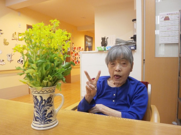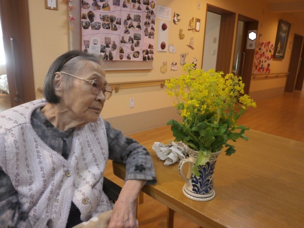 春と言えば菜の花。食べるのも見るのも。さぁ、この菜の花どこで咲いたのでしょうか?実はホーム長が食べようと菜の花を買ってきて、冷蔵庫にしまい忘れ、開けてびっくり!冷蔵庫の中で咲いたのです。それじゃあ、観賞用にとホームへ。でも、きれいですよね。