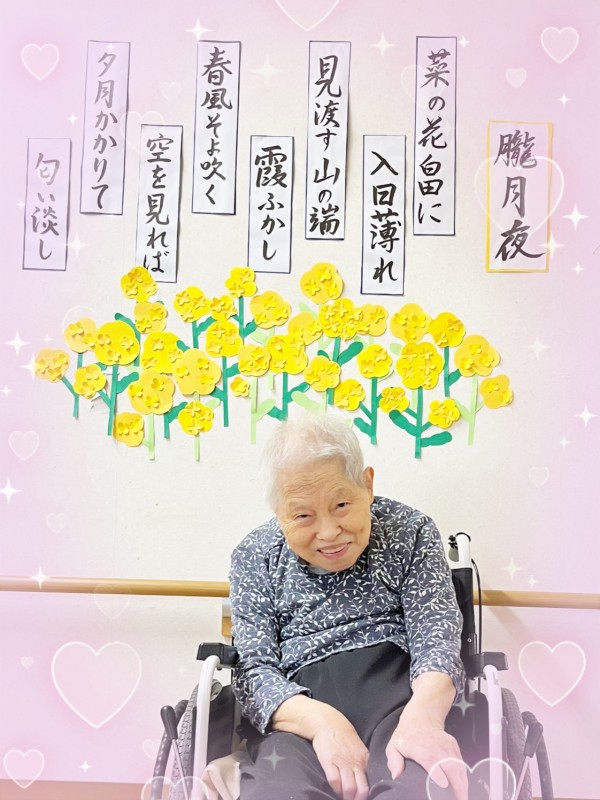 可愛い菜の花があちらこちらで黄色く春を彩っています。3月はH職員が夜勤中に壁紙制作してくれました!