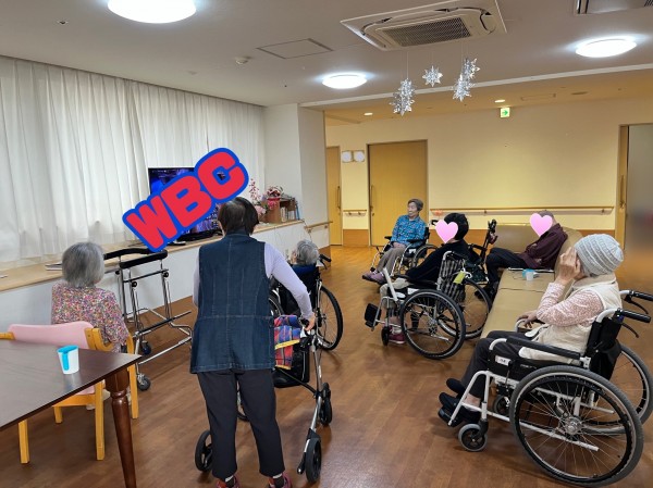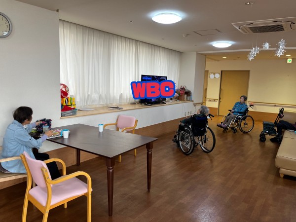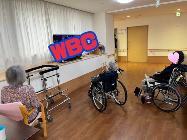 リビングで入居者様が観ているのは、世界が沸く『WBC』