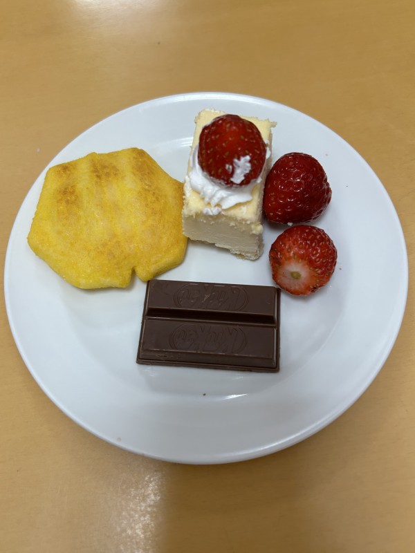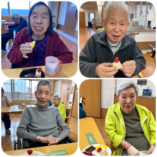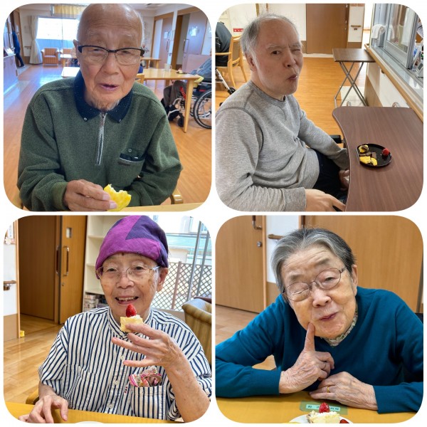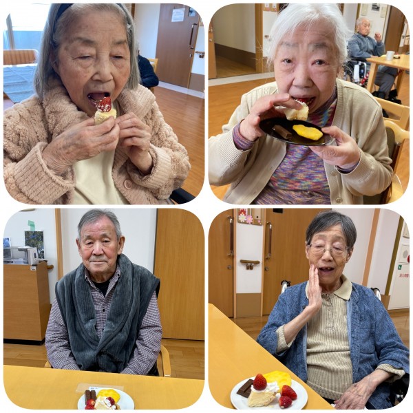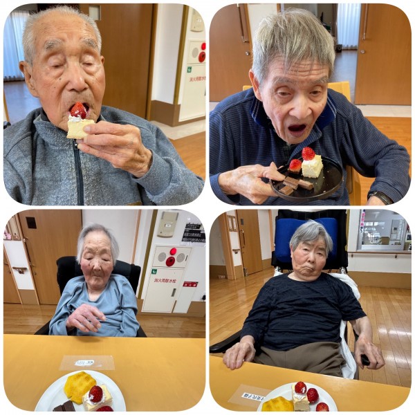 今回のおやつは毎日のおやつに百寿祝いのケーキを皆さんで分けていただきました。