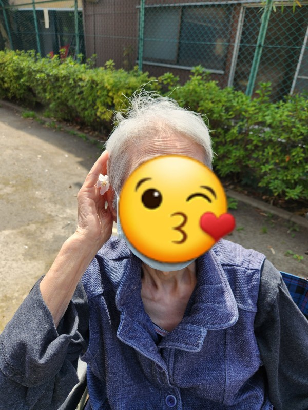 風になびく桜の花びらがちょうど入居者様の頭の上に落ちてきて、髪飾りのようにつけて写真を撮ってみました☆