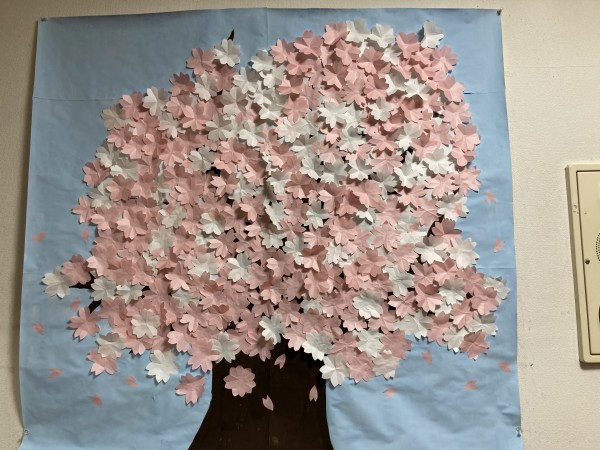 皆さん満開にと重ねて貼って下さり、あっという間に終わってしまい、追加で用意した折り紙で満開の桜が完成!!
