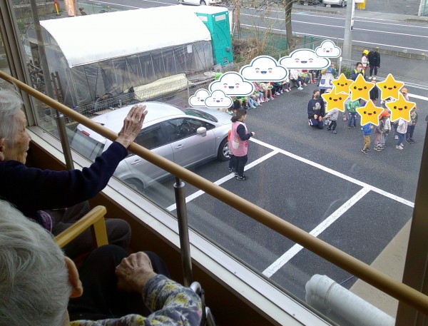 3月27日ご近所の保育園の子供たちが元気に訪問してくれました。 年長さんが卒園してしまうので、最後にダンスなどを披露しに来て くれました。