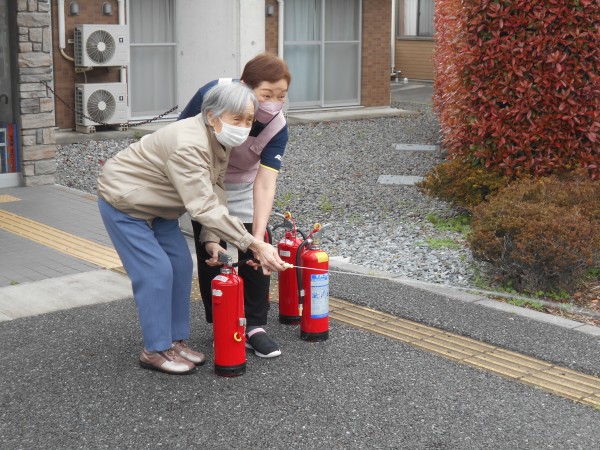 職員が消防署へ訓練の連絡を行い、入居者様たちといざという時の為に消火器の使い方を確認しました。