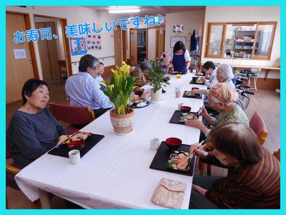 (そのままだと食べずらいご利用者様には、介護職員が適度にお寿司を切ってから提供しております。)