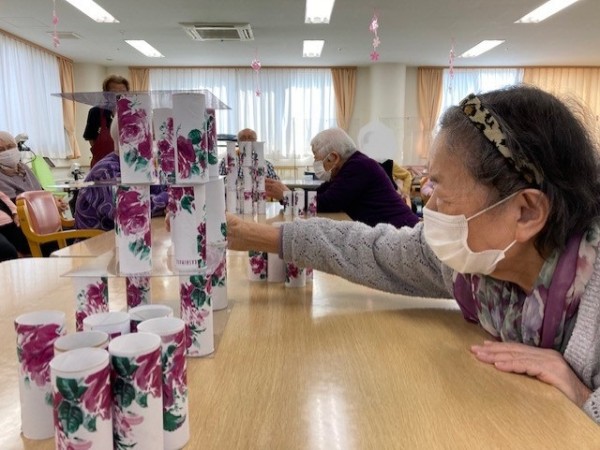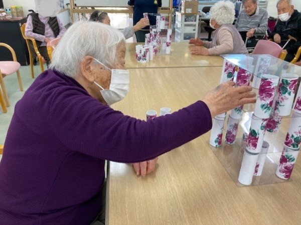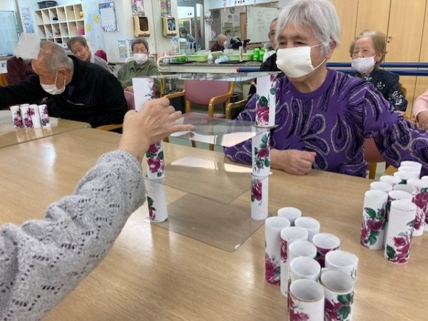 トイレットペーパー芯を9個並べ、アクリル板を上に乗せます。
