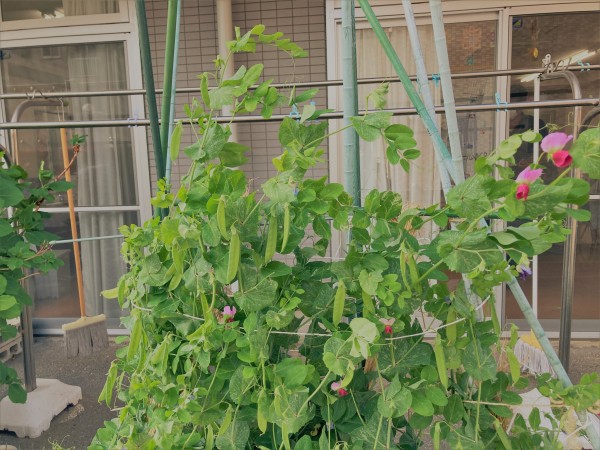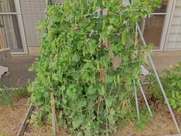 しばらく見ないうちに凄く立派に咲きました!そしてここまで見ればわかる、サヤエンドウがたくさんついています!!