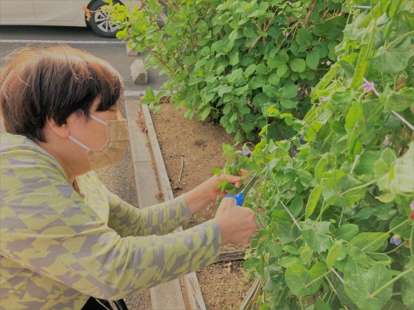 こういう収穫作業が得意なご利用者様とともに、早速サヤエンドウを採っていきます