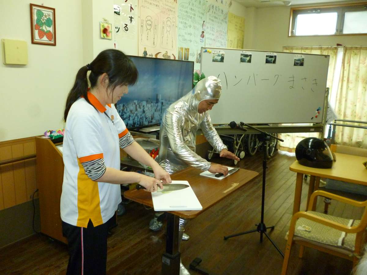 前回は劇団時のフロアの様子を紹介しましたが、これからハンバーグ作りの玉ねぎのみじん切りを先生が行ってくださるようです。
