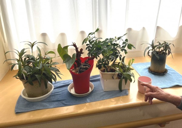 廊下の出窓にズラリと並ぶ、植木鉢。