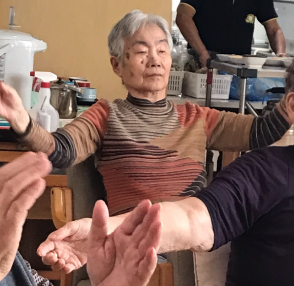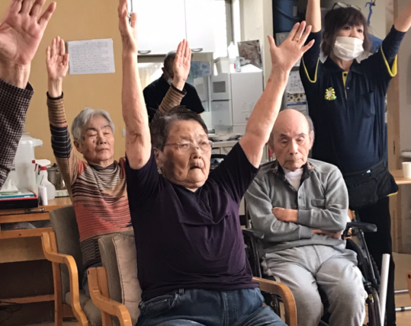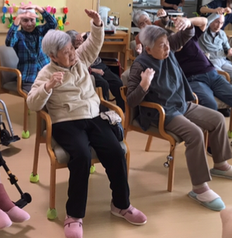 今回は1階2階合同でしたが、それ以外にも毎日フロアごとに、手足の末端を動かす 手足を大きく動かす リズムよく体を動かす の3つを組み合わせて身体機能の維持向上に努めています。
