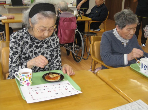 こんにちは! グループホームみんなの家・あきがせの介護ブログです! よろしくお願いいたします。 今日はおやつにホットケーキを作り召し上がっていただいているご様子をお知らせいたします!