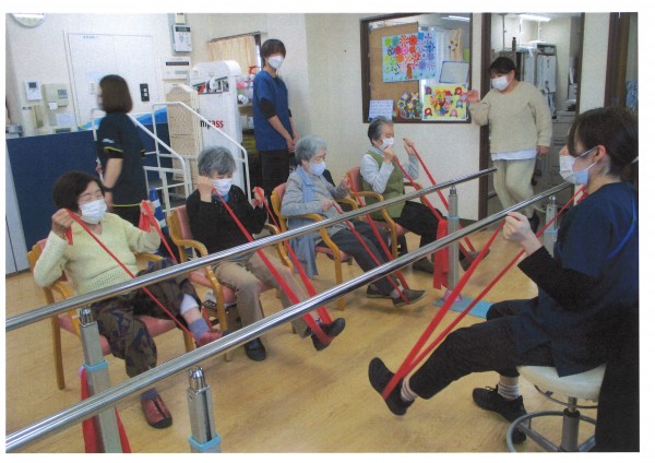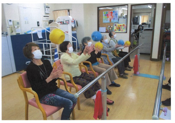 普段は個別機能訓練、皆様のニーズと体力を等を考慮しプログラムにそって各種運動を行っていますが、月の一週目はセラバンドとボールのメニューを取り入れ、普段使わない筋肉を道具を使って楽しく動かすエクササイズを行っています。