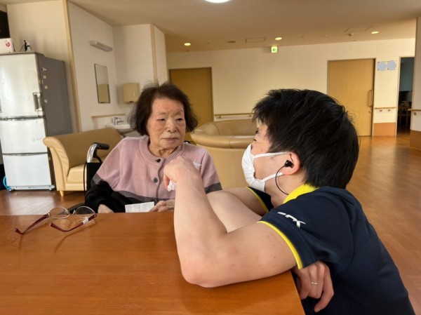 新入社員の後輩ケアスタッフに、教えているのは髙村くんです!