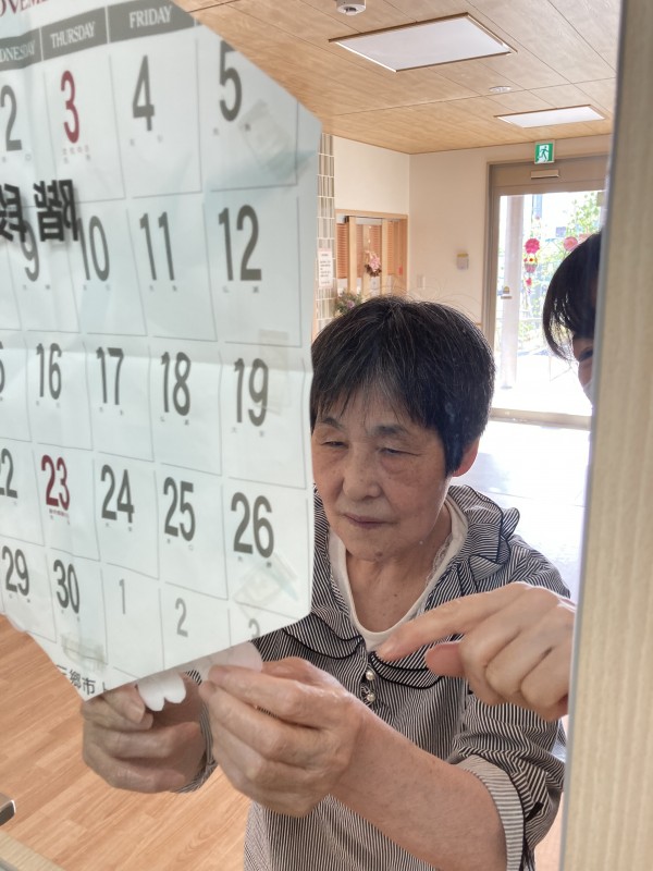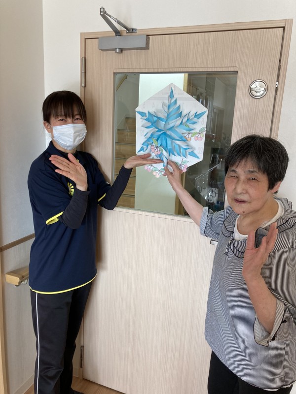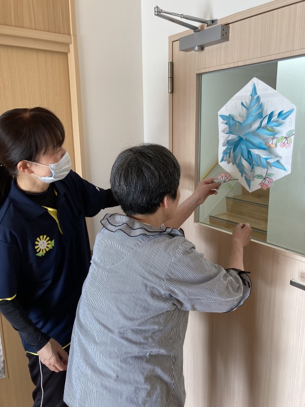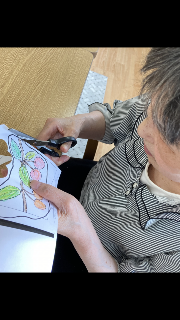 さくらんぼに色を付けてハサミで切ります。さて、どこに飾るのかな?「ここはどう?」「良いわね」と職員さんとご利用者様で話し合いながら貼っていきます。素敵な飾りに可愛いさがプラスされました♪