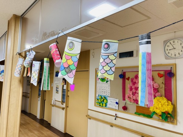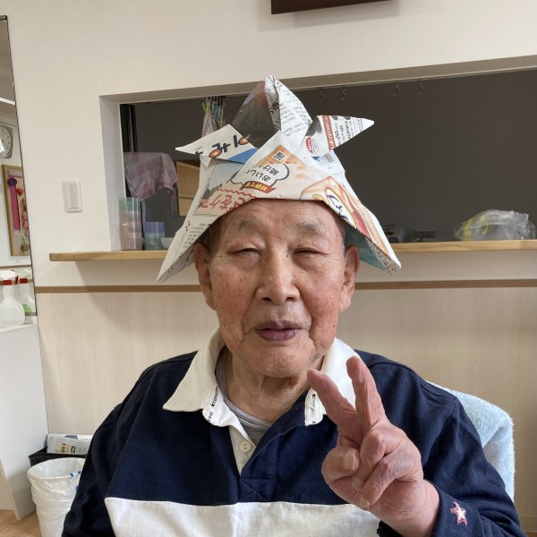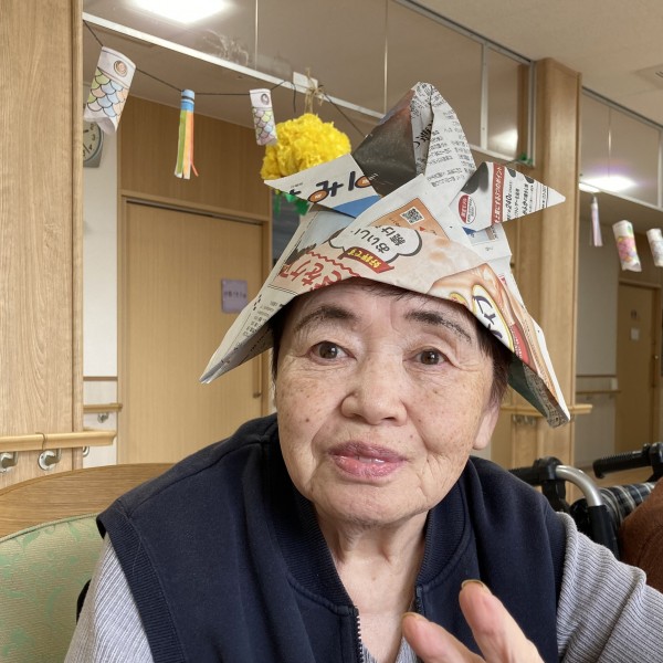 こちらは5月のフロア飾り作り!兜をかぶってハイチーズ♪