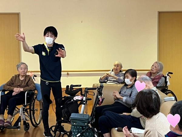 いつもの体操だけでなく、職員が色々と考えてやってくれています。