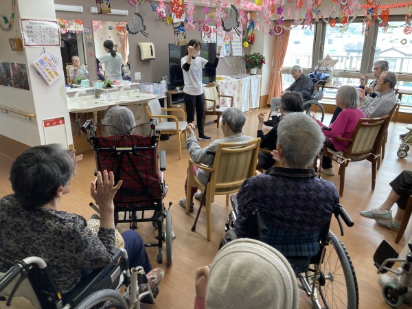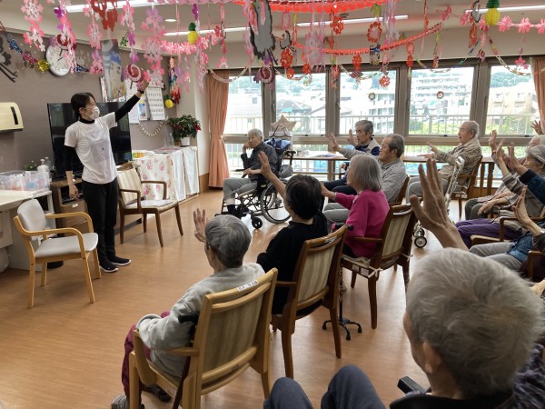 「みんなの家・川崎中野島」本日は月1回運動指導員の先生が直接ご指導くださるALSOK体操の時間です。