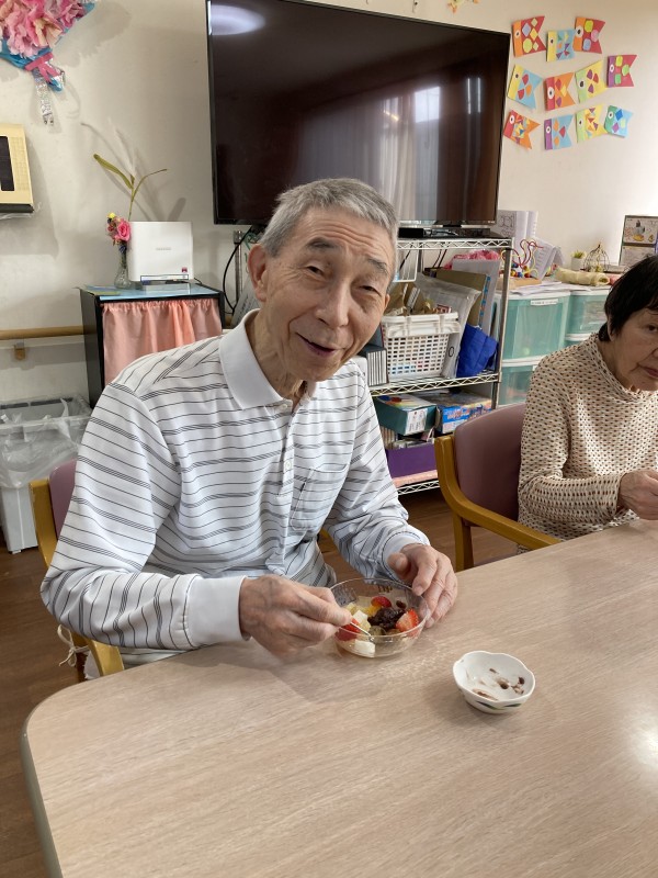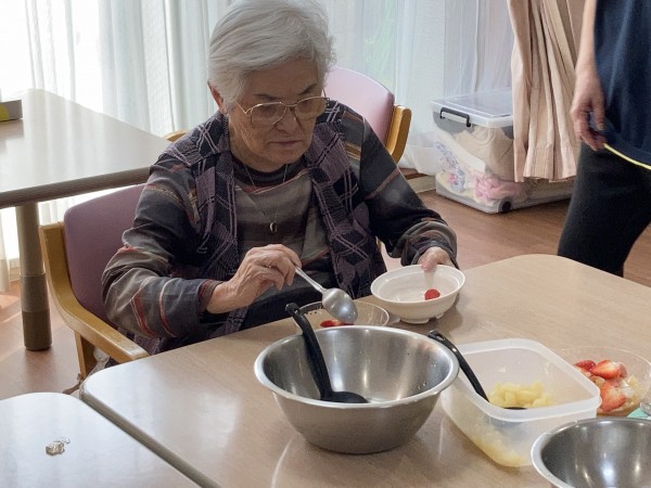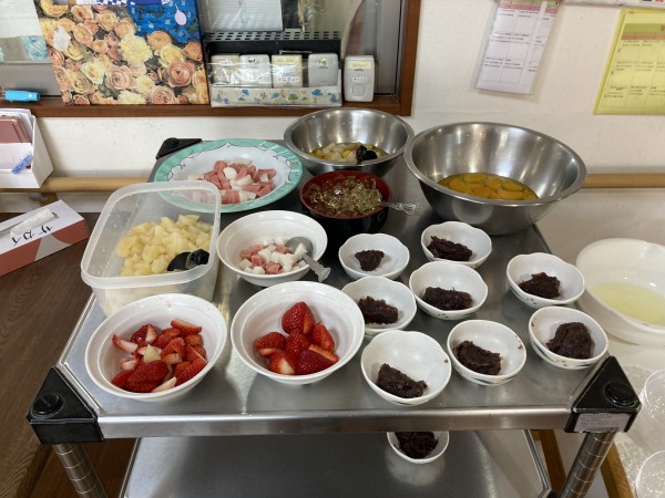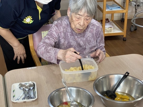 今日は、おやつレクリエーションにて『フルーツいっぱいあんみつ作り』をしました!!!