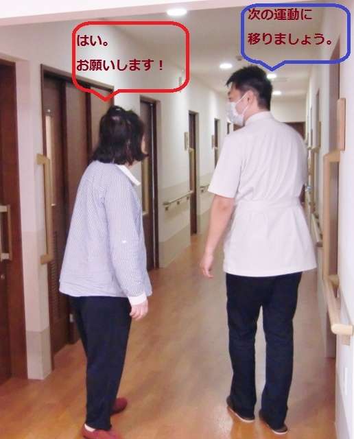 担当の施術師さんは、運動を始める前に必ずその日の状態を職員に確認してから、ご利用者様へ挨拶に向かわれます。