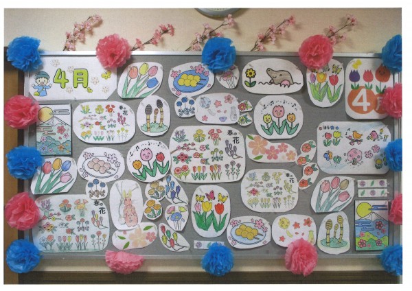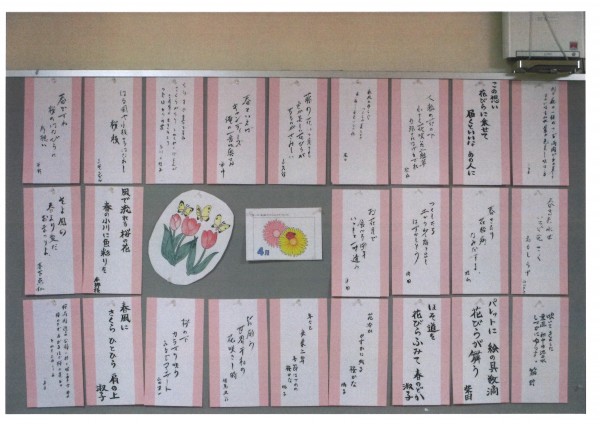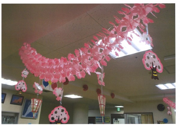 今月の塗り絵と川柳を紹介します。壁や天井も春らしく桜づくしです。皆様の塗ってくださった塗り絵とてもキレイですね。グレーの壁が春色に染まりました。