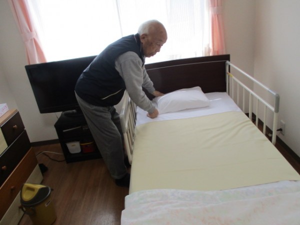 職員と一緒にシーツ交換を行いました。一緒にシーツをはがして新しいシーツに交換をしました( ^ω^)・・・ 綺麗に仕上がりました!(^^)! 《やっぱり、綺麗になるといいね! 気持ちいいもんね・・・///》と仰られました(^^♪