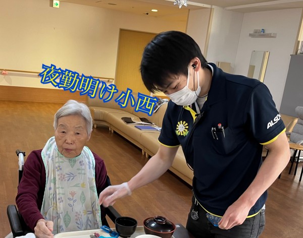 朝食前のリビングで、ご入居者様にご挨拶。