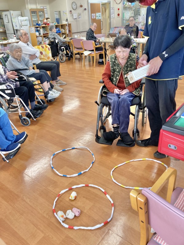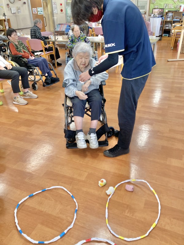 3色の輪っかの中へお手玉を投げて、入った数で点数を競います。