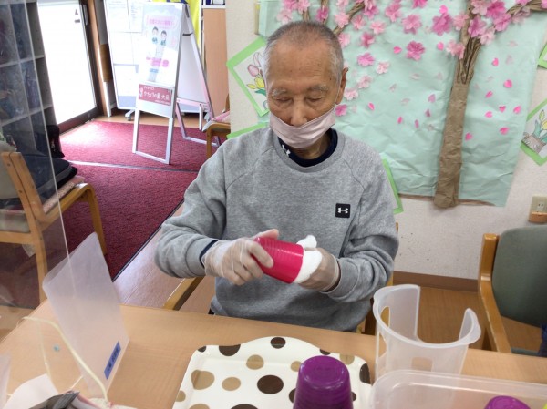片手で食器を落とさないように持ち片方で布巾を動かす。水滴が綺麗に拭けたか確認する。簡単な動作のようで意外に難しい。