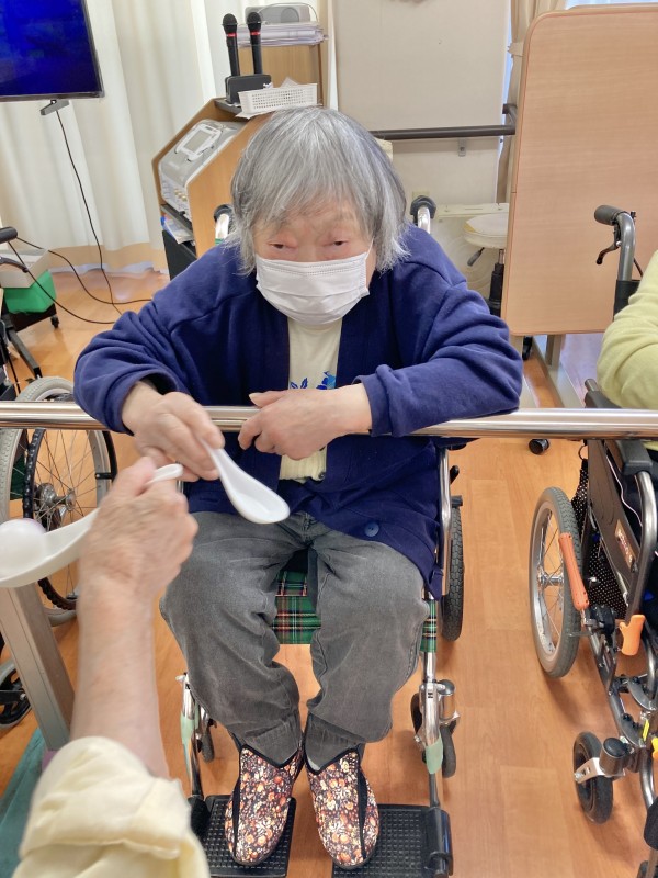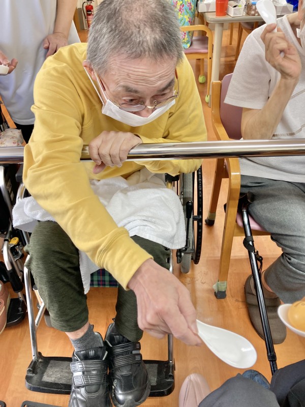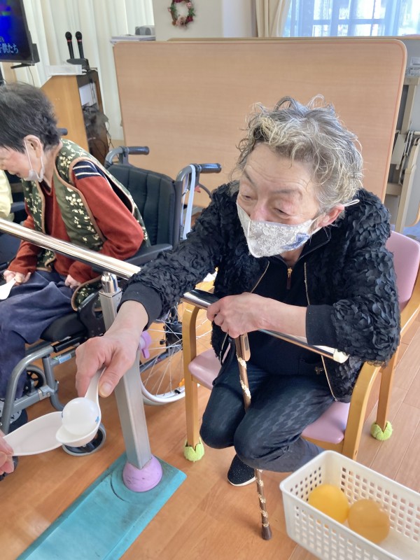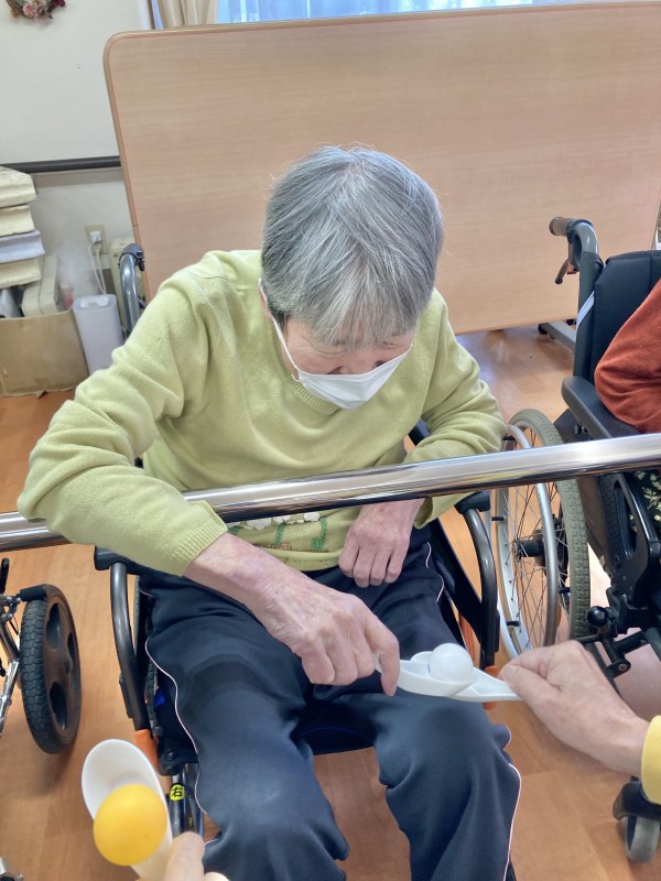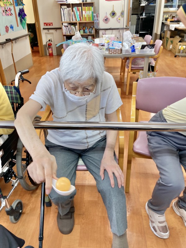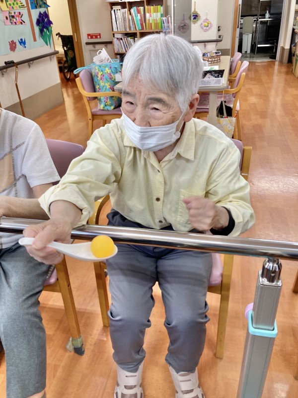れんげで球を渡していくゲームをした後に、運動を数種類行っています。それを何ゲームも繰り返し行っています。