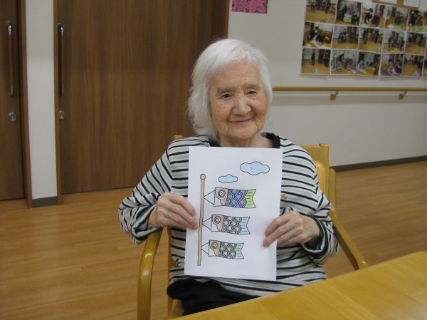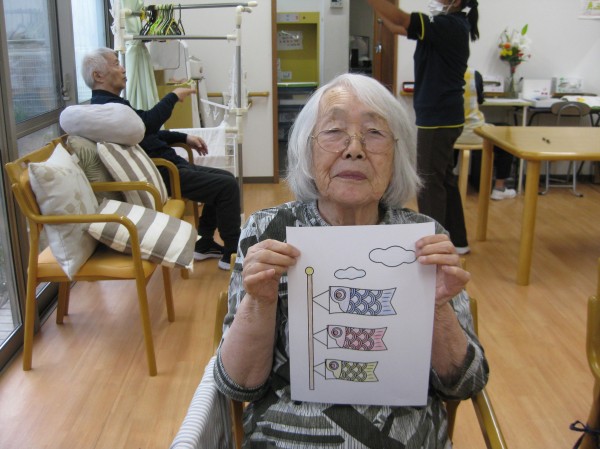 5月5日に向けて鯉のぼりの塗り絵を行いました( ^ω^)・・・ 《どの色にしようかしら? これがいいかな?》と考えながら職員に相談して完成していきました( ^)o(^ ) 「鯉のぼりあげたわね!」《兜も飾ったわね!》とお喋りしながら昔のことを思い出し嬉しそうにお話しされていました!(^^)!
