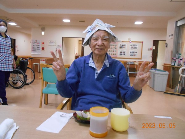 ご利用者様に新聞紙で作った兜をかぶっていただき