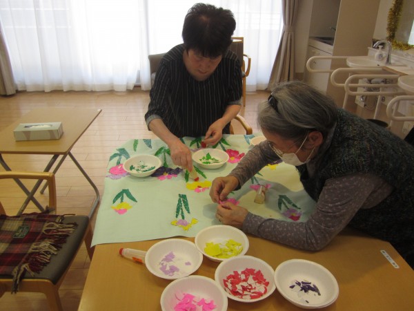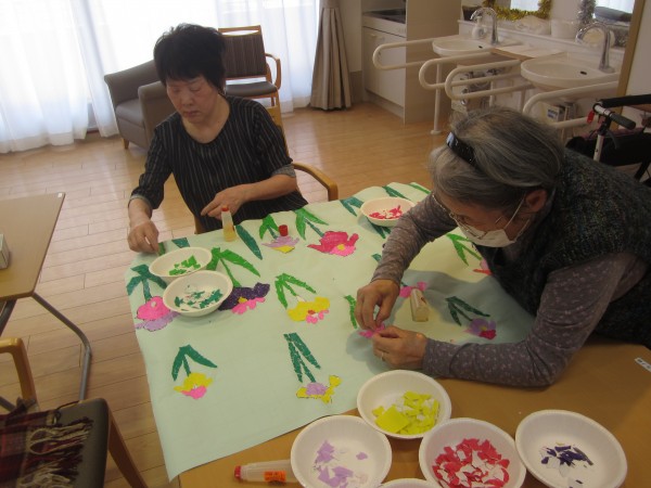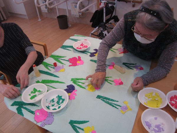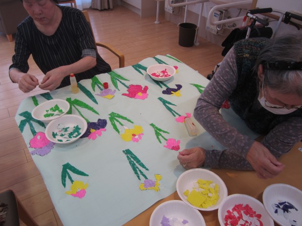 様々の色の折り紙などを細かく契り、ご利用者様の皆様と共に