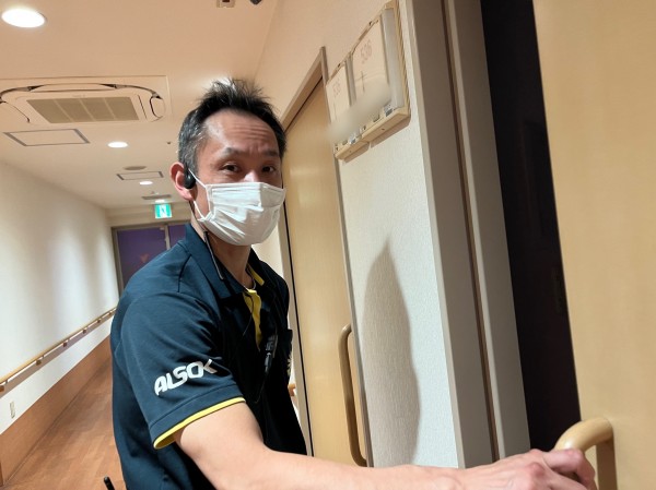 夜の対応をするケアスタッフ光くん、急に写真を撮られる。
