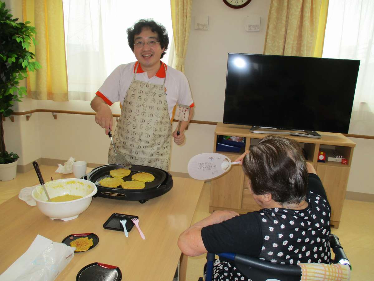 また、施設長が得意の手料理?です。今度はお好み焼きです。おかわりされるほど好評でした。