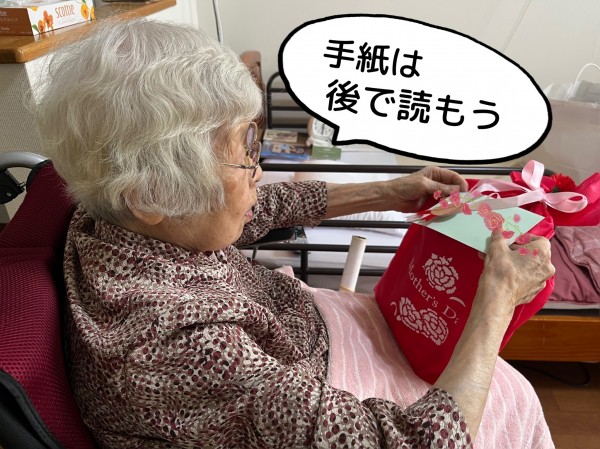 母の日のプレゼント、包みに手紙が付いています。