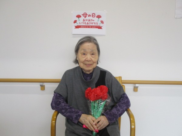 5/14母の日レクを行いました。職員からカーネーションをいただき嬉しそうでした( ^)o(^ ) 「お母さんありがとう!」照れくさそうでした(笑) 昔はこうだったのよ?とか色々なお話しをされて今いました( ^ω^)・・・ カーネーションのお花の力って凄いです~ みんなを元気にしました!! 楽しまれたひと時でした(^^♪